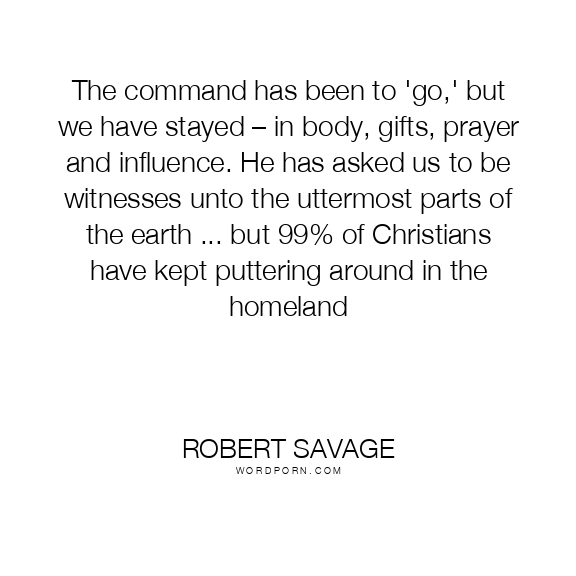 The command has been to 'go,' but we have stayed – in body, gifts, prayer and influence. He has asked us to be witnesses unto the uttermost parts of the earth ... but 99% of Christians have kept puttering around in the homeland