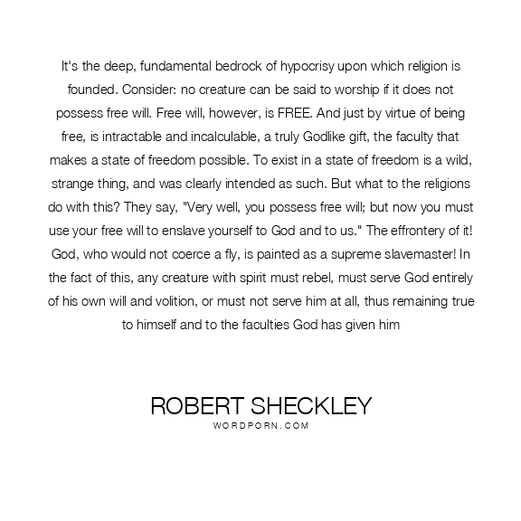 It's the deep, fundamental bedrock of hypocrisy upon which religion is founded. Consider: no creature can be said to worship if it does not possess free will. Free will, however, is FREE. And just by virtue of being free, is intractable and incalculable, a truly Godlike gift, the faculty that makes a state of freedom possible. To exist in a state of freedom is a wild, strange thing, and was clearly intended as such. But what to the religions do with this? They say, "Very well, you possess free will; but now you must use your free will to enslave yourself to God and to us." The effrontery of it! God, who would not coerce a fly, is painted as a supreme slavemaster! In the fact of this, any creature with spirit must rebel, must serve God entirely of his own will and volition, or must not serve him at all, thus remaining true to himself and to the faculties God has given him