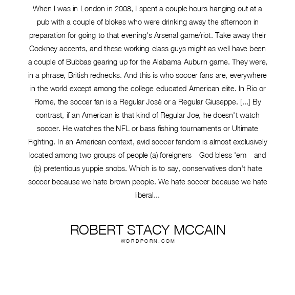 When I was in London in 2008, I spent a couple hours hanging out at a pub with a couple of blokes who were drinking away the afternoon in preparation for going to that evening's Arsenal game/riot. Take away their Cockney accents, and these working-class guys might as well have been a couple of Bubbas gearing up for the Alabama-Auburn game. They were, in a phrase, British rednecks. And this is who soccer fans are, everywhere in the world except among the college-educated American elite. In Rio or Rome, the soccer fan is a Regular José or a Regular Giuseppe. [...] By contrast, if an American is that kind of Regular Joe, he doesn't watch soccer. He watches the NFL or bass fishing tournaments or Ultimate Fighting. In an American context, avid soccer fandom is almost exclusively located among two groups of people (a) foreigners—God bless 'em—and (b) pretentious yuppie snobs. Which is to say, conservatives don't hate soccer because we hate brown people. We hate soccer because we hate liberals