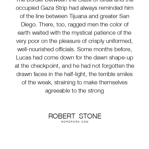 The border between the State of Israel and the occupied Gaza Strip had always reminded him of the line between Tijuana and greater San Diego. There, too, ragged men the color of earth waited with the mystical patience of the very poor on the pleasure of crisply uniformed, well-nourished officials. Some months before, Lucas had come down for the dawn shape-up at the checkpoint, and he had not forgotten the drawn faces in the half-light, the terrible smiles of the weak, straining to make themselves agreeable to the strong