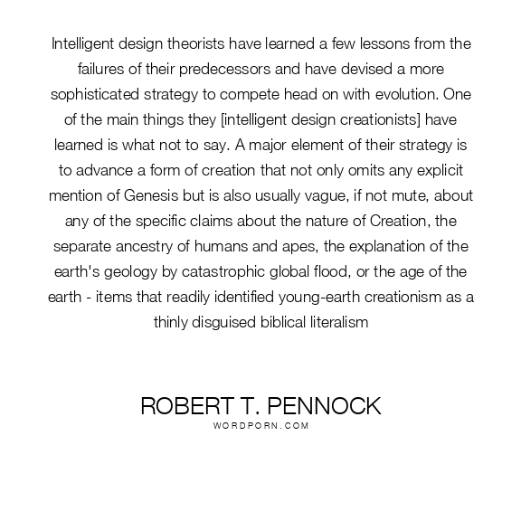 Intelligent design theorists have learned a few lessons from the failures of their predecessors and have devised a more sophisticated strategy to compete head on with evolution. One of the main things they [intelligent design creationists] have learned is what not to say. A major element of their strategy is to advance a form of creation that not only omits any explicit mention of Genesis but is also usually vague, if not mute, about any of the specific claims about the nature of Creation, the separate ancestry of humans and apes, the explanation of the earth's geology by catastrophic global flood, or the age of the earth - items that readily identified young-earth creationism as a thinly disguised biblical literalism
