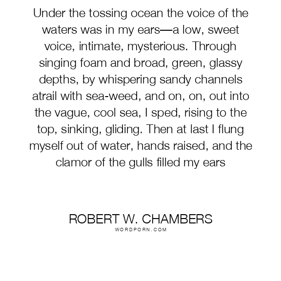 Under the tossing ocean the voice of the waters was in my ears—a low, sweet voice, intimate, mysterious. Through singing foam and broad, green, glassy depths, by whispering sandy channels atrail with sea-weed, and on, on, out into the vague, cool sea, I sped, rising to the top, sinking, gliding. Then at last I flung myself out of water, hands raised, and the clamor of the gulls filled my ears