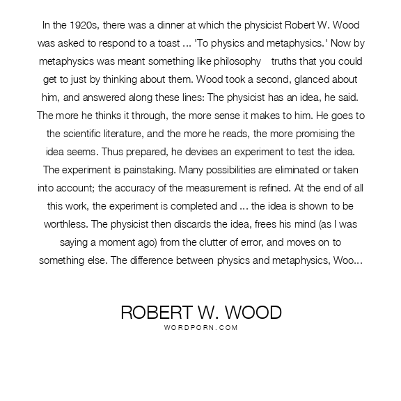 In the 1920s, there was a dinner at which the physicist Robert W. Wood was asked to respond to a toast ... 'To physics and metaphysics.' Now by metaphysics was meant something like philosophy—truths that you could get to just by thinking about them. Wood took a second, glanced about him, and answered along these lines: The physicist has an idea, he said. The more he thinks it through, the more sense it makes to him. He goes to the scientific literature, and the more he reads, the more promising the idea seems. Thus prepared, he devises an experiment to test the idea. The experiment is painstaking. Many possibilities are eliminated or taken into account; the accuracy of the measurement is refined. At the end of all this work, the experiment is completed and ... the idea is shown to be worthless. The physicist then discards the idea, frees his mind (as I was saying a moment ago) from the clutter of error, and moves on to something else. The difference between physics and metaphysics, Wood concluded, is that the metaphysicist has no laboratory
