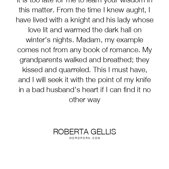 It is too late for me to learn your wisdom in this matter. From the time I knew aught, I have lived with a knight and his lady whose love lit and warmed the dark hall on winter's nights. Madam, my example comes not from any book of romance. My grandparents walked and breathed; they kissed and quarreled. This I must have, and I will seek it with the point of my knife in a bad husband's heart if I can find it no other way