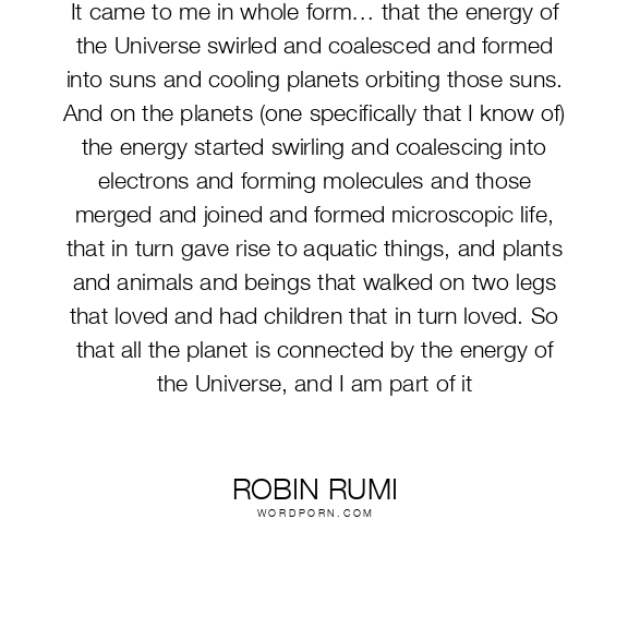 It came to me in whole form… that the energy of the Universe swirled and coalesced and formed into suns and cooling planets orbiting those suns. And on the planets (one specifically that I know of) the energy started swirling and coalescing into electrons and forming molecules and those merged and joined and formed microscopic life, that in turn gave rise to aquatic things, and plants and animals and beings that walked on two legs that loved and had children that in turn loved. So that all the planet is connected by the energy of the Universe, and I am part of it
