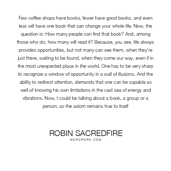 Few coffee shops have books, fewer have good books, and even less will have one book that can change your whole life. Now, the question is: How many people can find that book? And, among those who do, how many will read it? Because, you see, life always provides opportunities, but not many can see them, when they're just there, waiting to be found, when they come our way, even if in the most unexpected place in the world. One has to be very sharp to recognize a window of opportunity in a wall of illusions. And the ability to redirect attention, demands that one can be capable as well of knowing his own limitations in the vast sea of energy and vibrations. Now, I could be talking about a book, a group or a person, as the axiom remains true to itself
