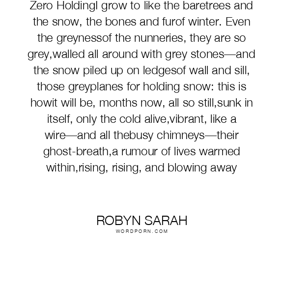 Zero HoldingI grow to like the baretrees and the snow, the bones and furof winter. Even the greynessof the nunneries, they are so grey,walled all around with grey stones—and the snow piled up on ledgesof wall and sill, those greyplanes for holding snow: this is howit will be, months now, all so still,sunk in itself, only the cold alive,vibrant, like a wire—and all thebusy chimneys—their ghost-breath,a rumour of lives warmed within,rising, rising, and blowing away