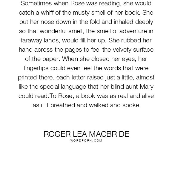 Sometimes when Rose was reading, she would catch a whiff of the musty smell of her book. She put her nose down in the fold and inhaled deeply so that wonderful smell, the smell of adventure in faraway lands, would fill her up. She rubbed her hand across the pages to feel the velvety surface of the paper. When she closed her eyes, her fingertips could even feel the words that were printed there, each letter raised just a little, almost like the special language that her blind aunt Mary could read.To Rose, a book was as real and alive as if it breathed and walked and spoke