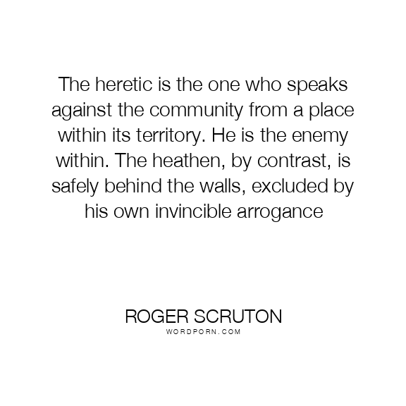 The heretic is the one who speaks against the community from a place within its territory. He is the enemy within. The heathen, by contrast, is safely behind the walls, excluded by his own invincible arrogance