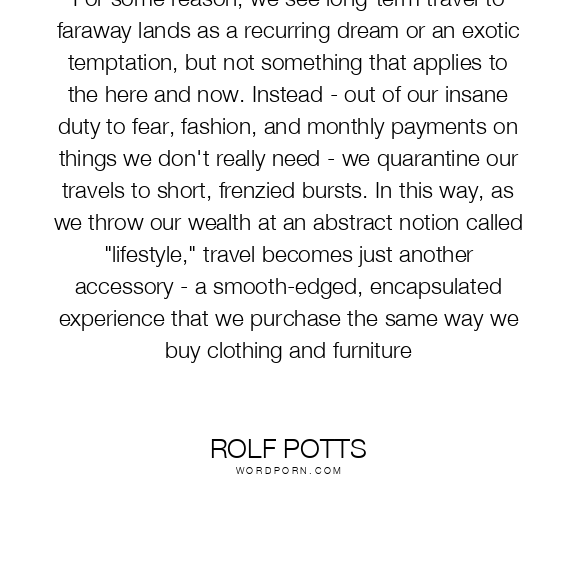 For some reason, we see long-term travel to faraway lands as a recurring dream or an exotic temptation, but not something that applies to the here and now. Instead - out of our insane duty to fear, fashion, and monthly payments on things we don't really need - we quarantine our travels to short, frenzied bursts. In this way, as we throw our wealth at an abstract notion called "lifestyle," travel becomes just another accessory - a smooth-edged, encapsulated experience that we purchase the same way we buy clothing and furniture