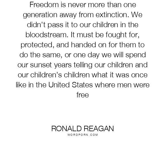 Freedom is never more than one generation away from extinction. We didn't pass it to our children in the bloodstream. It must be fought for, protected, and handed on for them to do the same, or one day we will spend our sunset years telling our children and our children's children what it was once like in the United States where men were free