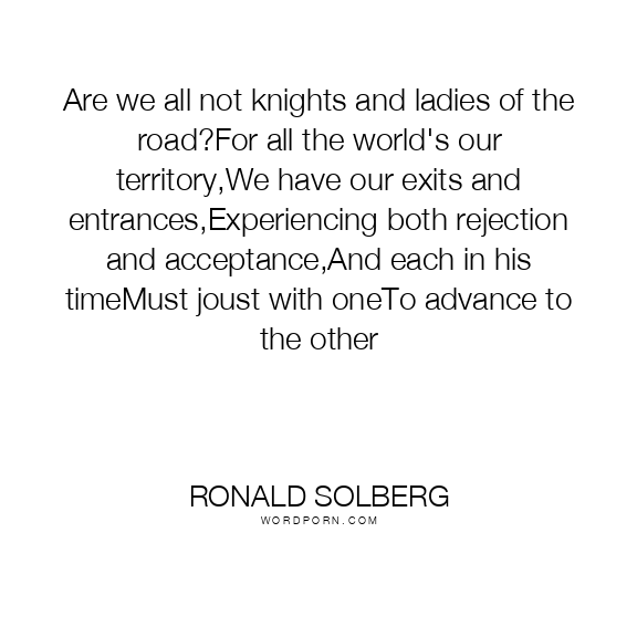 Are we all not knights and ladies of the road?For all the world's our territory,We have our exits and entrances,Experiencing both rejection and acceptance,And each in his timeMust joust with oneTo advance to the other