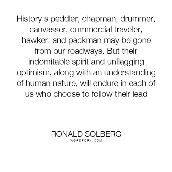 History's peddler, chapman, drummer, canvasser, commercial traveler, hawker, and packman may be gone from our roadways. But their indomitable spirit and unflagging optimism, along with an understanding of human nature, will endure in each of us who choose to follow their lead