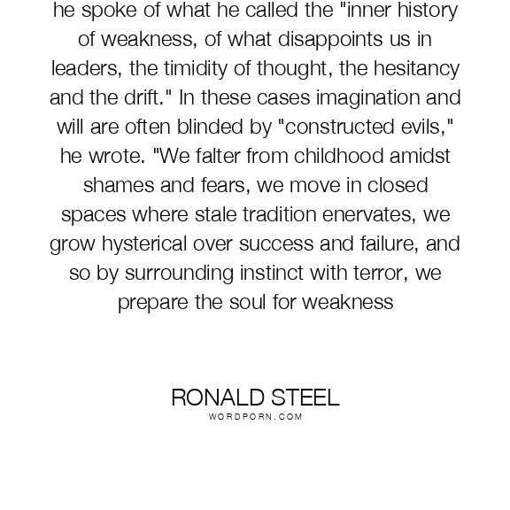 he spoke of what he called the "inner history of weakness, of what disappoints us in leaders, the timidity of thought, the hesitancy and the drift." In these cases imagination and will are often blinded by "constructed evils," he wrote. "We falter from childhood amidst shames and fears, we move in closed spaces where stale tradition enervates, we grow hysterical over success and failure, and so by surrounding instinct with terror, we prepare the soul for weakness