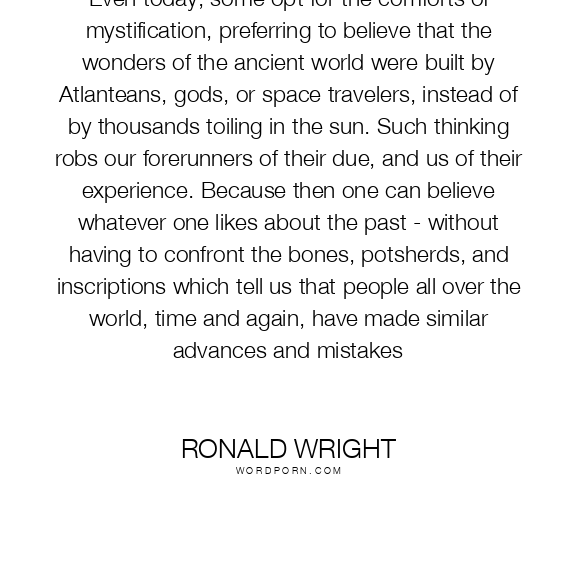 Even today, some opt for the comforts of mystification, preferring to believe that the wonders of the ancient world were built by Atlanteans, gods, or space travelers, instead of by thousands toiling in the sun. Such thinking robs our forerunners of their due, and us of their experience. Because then one can believe whatever one likes about the past - without having to confront the bones, potsherds, and inscriptions which tell us that people all over the world, time and again, have made similar advances and mistakes