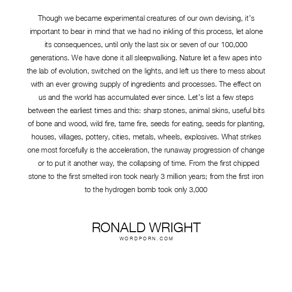 Though we became experimental creatures of our own devising, it’s important to bear in mind that we had no inkling of this process, let alone its consequences, until only the last six or seven of our 100,000 generations. We have done it all sleepwalking. Nature let a few apes into the lab of evolution, switched on the lights, and left us there to mess about with an ever-growing supply of ingredients and processes. The effect on us and the world has accumulated ever since. Let’s list a few steps between the earliest times and this: sharp stones, animal skins, useful bits of bone and wood, wild fire, tame fire, seeds for eating, seeds for planting, houses, villages, pottery, cities, metals, wheels, explosives. What strikes one most forcefully is the acceleration, the runaway progression of change - or to put it another way, the collapsing of time. From the first chipped stone to the first smelted iron took nearly 3 million years; from the first iron to the hydrogen bomb took only 3,000