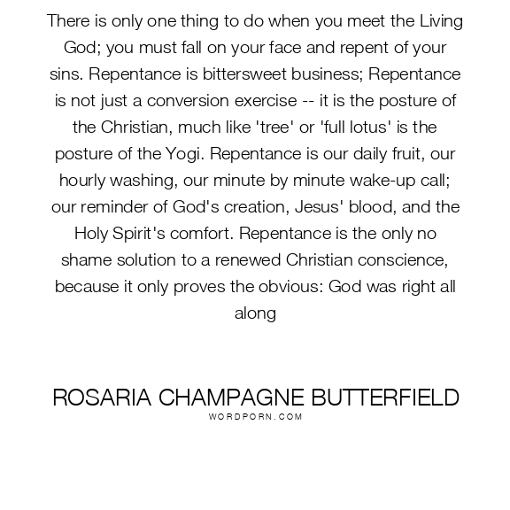 There is only one thing to do when you meet the Living God; you must fall on your face and repent of your sins. Repentance is bittersweet business; Repentance is not just a conversion exercise -- it is the posture of the Christian, much like 'tree' or 'full lotus' is the posture of the Yogi. Repentance is our daily fruit, our hourly washing, our minute by minute wake-up call; our reminder of God's creation, Jesus' blood, and the Holy Spirit's comfort. Repentance is the only no shame solution to a renewed Christian conscience, because it only proves the obvious: God was right all along