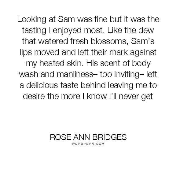 Looking at Sam was fine but it was the tasting I enjoyed most. Like the dew that watered fresh blossoms, Sam’s lips moved and left their mark against my heated skin. His scent of body wash and manliness– too inviting– left a delicious taste behind leaving me to desire the more I know I’ll never get