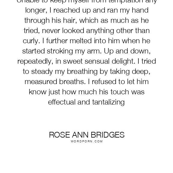 Unable to keep myself from temptation any longer, I reached up and ran my hand through his hair, which as much as he tried, never looked anything other than curly. I further melted into him when he started stroking my arm. Up and down, repeatedly, in sweet sensual delight. I tried to steady my breathing by taking deep, measured breaths. I refused to let him know just how much his touch was effectual and tantalizing