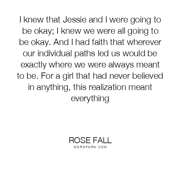 I knew that Jessie and I were going to be okay; I knew we were all going to be okay. And I had faith that wherever our individual paths led us would be exactly where we were always meant to be. For a girl that had never believed in anything, this realization meant everything