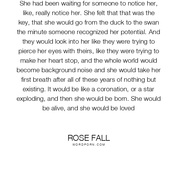 She had been waiting for someone to notice her, like, really notice her. She felt that that was the key, that she would go from the duck to the swan the minute someone recognized her potential. And they would look into her like they were trying to pierce her eyes with theirs, like they were trying to make her heart stop, and the whole world would become background noise and she would take her first breath after all of these years of nothing but existing. It would be like a coronation, or a star exploding, and then she would be born. She would be alive, and she would be loved