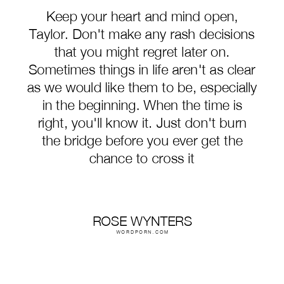 Keep your heart and mind open, Taylor. Don't make any rash decisions that you might regret later on. Sometimes things in life aren't as clear as we would like them to be, especially in the beginning. When the time is right, you'll know it. Just don't burn the bridge before you ever get the chance to cross it