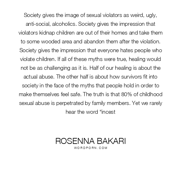 Society gives the image of sexual violators as weird, ugly, anti-social, alcoholics. Society gives the impression that violators kidnap children are out of their homes and take them to some wooded area and abandon them after the violation. Society gives the impression that everyone hates people who violate children. If all of these myths were true, healing would not be as challenging as it is. Half of our healing is about the actual abuse. The other half is about how survivors fit into society in the face of the myths that people hold in order to make themselves feel safe. The truth is that 80% of childhood sexual abuse is perpetrated by family members. Yet we rarely hear the word “incest