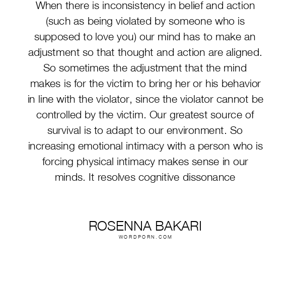 When there is inconsistency in belief and action (such as being violated by someone who is supposed to love you) our mind has to make an adjustment so that thought and action are aligned. So sometimes the adjustment that the mind makes is for the victim to bring her or his behavior in line with the violator, since the violator cannot be controlled by the victim. Our greatest source of survival is to adapt to our environment. So increasing emotional intimacy with a person who is forcing physical intimacy makes sense in our minds. It resolves cognitive dissonance