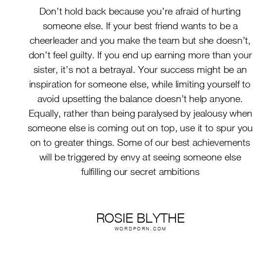 Don’t hold back because you’re afraid of hurting someone else. If your best friend wants to be a cheerleader and you make the team but she doesn’t, don’t feel guilty. If you end up earning more than your sister, it’s not a betrayal. Your success might be an inspiration for someone else, while limiting yourself to avoid upsetting the balance doesn’t help anyone. Equally, rather than being paralysed by jealousy when someone else is coming out on top, use it to spur you on to greater things. Some of our best achievements will be triggered by envy at seeing someone else fulfilling our secret ambitions