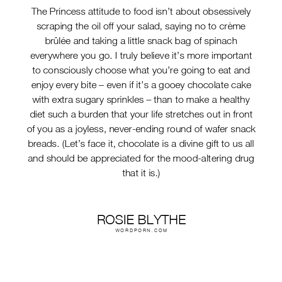 The Princess attitude to food isn’t about obsessively scraping the oil off your salad, saying no to crème brûlée and taking a little snack bag of spinach everywhere you go. I truly believe it’s more important to consciously choose what you’re going to eat and enjoy every bite – even if it’s a gooey chocolate cake with extra sugary sprinkles – than to make a healthy diet such a burden that your life stretches out in front of you as a joyless, never-ending round of wafer snack breads. (Let’s face it, chocolate is a divine gift to us all and should be appreciated for the mood-altering drug that it is.)