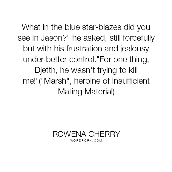 What in the blue star-blazes did you see in Jason?" he asked, still forcefully but with his frustration and jealousy under better control."For one thing, Djetth, he wasn't trying to kill me!"("Marsh", heroine of Insufficient Mating Material)