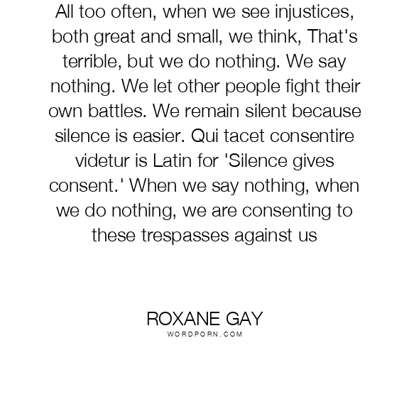 All too often, when we see injustices, both great and small, we think, That's terrible, but we do nothing. We say nothing. We let other people fight their own battles. We remain silent because silence is easier. Qui tacet consentire videtur is Latin for 'Silence gives consent.' When we say nothing, when we do nothing, we are consenting to these trespasses against us