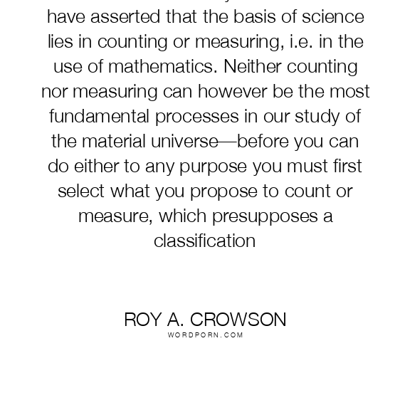 There have been many authorities who have asserted that the basis of science lies in counting or measuring, i.e. in the use of mathematics. Neither counting nor measuring can however be the most fundamental processes in our study of the material universe—before you can do either to any purpose you must first select what you propose to count or measure, which presupposes a classification