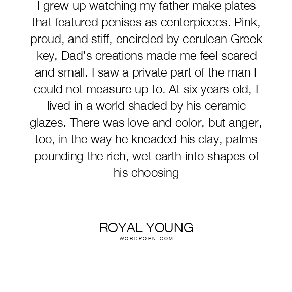 I grew up watching my father make plates that featured penises as centerpieces. Pink, proud, and stiff, encircled by cerulean Greek key, Dad’s creations made me feel scared and small. I saw a private part of the man I could not measure up to. At six years old, I lived in a world shaded by his ceramic glazes. There was love and color, but anger, too, in the way he kneaded his clay, palms pounding the rich, wet earth into shapes of his choosing
