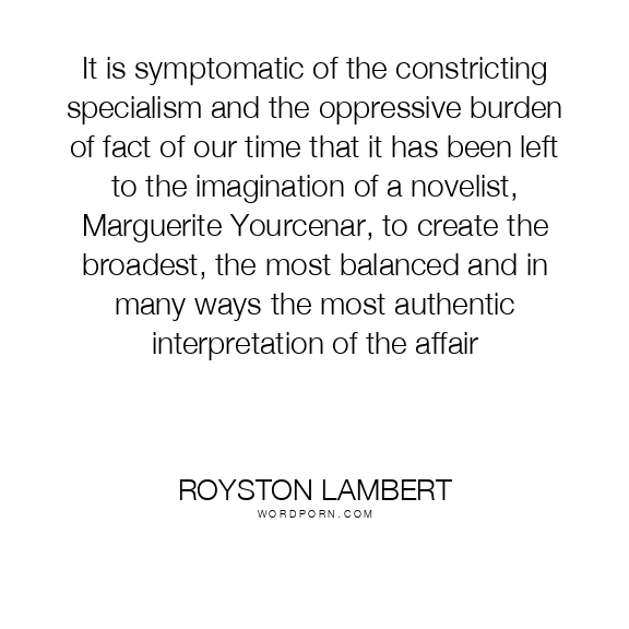 It is symptomatic of the constricting specialism and the oppressive burden of fact of our time that it has been left to the imagination of a novelist, Marguerite Yourcenar, to create the broadest, the most balanced and in many ways the most authentic interpretation of the affair