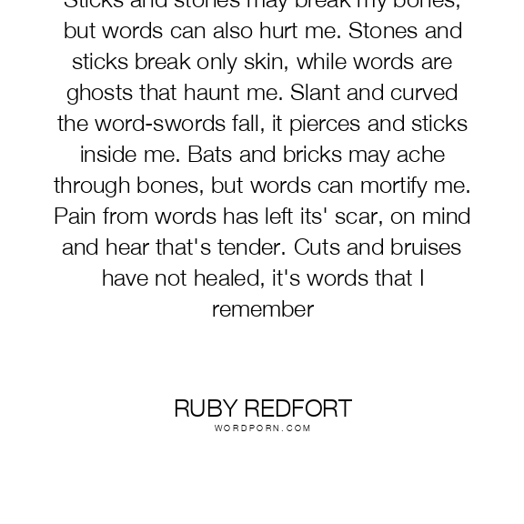 Sticks and stones may break my bones, but words can also hurt me. Stones and sticks break only skin, while words are ghosts that haunt me. Slant and curved the word-swords fall, it pierces and sticks inside me. Bats and bricks may ache through bones, but words can mortify me. Pain from words has left its' scar, on mind and hear that's tender. Cuts and bruises have not healed, it's words that I remember
