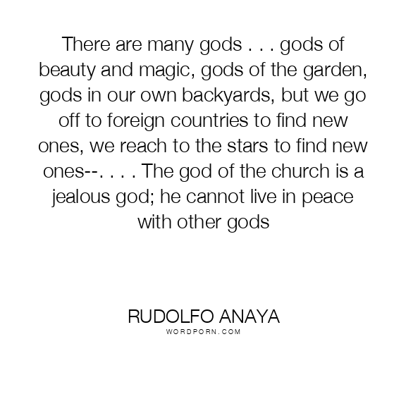 There are many gods . . . gods of beauty and magic, gods of the garden, gods in our own backyards, but we go off to foreign countries to find new ones, we reach to the stars to find new ones--. . . . The god of the church is a jealous god; he cannot live in peace with other gods