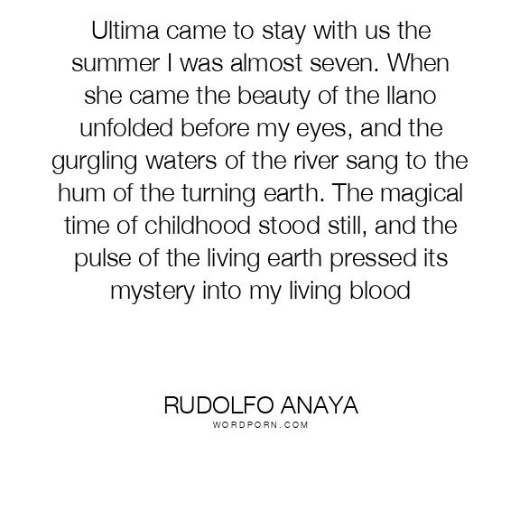 Ultima came to stay with us the summer I was almost seven. When she came the beauty of the llano unfolded before my eyes, and the gurgling waters of the river sang to the hum of the turning earth. The magical time of childhood stood still, and the pulse of the living earth pressed its mystery into my living blood