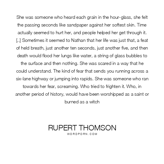 She was someone who heard each grain in the hour-glass, she felt the passing seconds like sandpaper against her softest skin. Time actually seemed to hurt her, and people helped her get through it. [..] Sometimes it seemed to Nathan that her life was just that, a feat of held breath, just another ten seconds, just another five, and then death would flood her lungs like water, a string of glass bubbles to the surface and then nothing. She was scared in a way that he could understand. The kind of fear that sends you running across a six-lane highway or jumping into rapids. She was someone who ran towards her fear, screaming. Who tried to frighten it. Who, in another period of history, would have been worshipped as a saint or burned as a witch