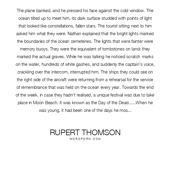 The plane banked, and he pressed his face against the cold window. The ocean tilted up to meet him, its dark surface studded with points of light that looked like constellations, fallen stars. The tourist sitting next to him asked him what they were. Nathan explained that the bright lights marked the boundaries of the ocean cemeteries. The lights that were fainter were memory buoys. They were the equivalent of tombstones on land: they marked the actual graves. While he was talking he noticed scratch-marks on the water, hundreds of white gashes, and suddenly the captain's voice, crackling over the intercom, interrupted him. The ships they could see on the right side of the aircraft were returning from a rehearsal for the service of remembrance that was held on the ocean every year. Towards the end of the week, in case they hadn't realised, a unique festival was due to take place in Moon Beach. It was known as the Day of the Dead......When he was young, it had been one of the days he most looked forward to. Yvonne would come and stay, and she'd always bring a fish with her, a huge fish freshly caught on the ocean, and she'd gut it on the kitchen table. Fish should be eaten, she'd said, because fish were the guardians of the soul, and she was so powerful in her belief that nobody dared to disagree. He remembered how the fish lay gaping on its bed of newspaper, the flesh dark-red and subtly ribbed where it was split in half, and Yvonne with her sleeves rolled back and her wrists dipped in blood that smelt of tin.It was a day that abounded in peculiar traditions. Pass any candy store in the city and there'd be marzipan skulls and sugar fish and little white chocolate bones for 5 cents each. Pass any bakery and you'd see cakes slathered in blue icing, cakes sprinkled with sea-salt.If you made a Day of the Dead cake at home you always hid a coin in it, and the person who found it was supposed to live forever. Once, when she was four, Georgia had swallowed the coin and almost choked. It was still one of her favourite stories about herself. In the afternoon, there'd be costume parties. You dressed up as Lazarus or Frankenstein, or you went as one of your dead relations. Or, if you couldn't think of anything else, you just wore something blue because that was the colour you went when you were buried at the bottom of the ocean. And everywhere there were bowls of candy and slices of special home-made Day of the Dead cake. Nobody's mother ever got it right. You always had to spit it out and shove it down the back of some chair. Later, when it grew dark, a fleet of ships would set sail for the ocean cemeteries, and the remembrance service would be held. Lying awake in his room, he'd imagine the boats rocking the the priest's voice pushed and pulled by the wind. And then, later still, after the boats had gone, the dead would rise from the ocean bed and walk on the water. They gathered the flowers that had been left as offerings, they blew the floating candles out. Smoke that smelt of churches poured from the wicks, drifted over the slowly heaving ocean, hid their feet. It was a night of strange occurrences. It was the night that everyone was Jesus......Thousands drove in for the celebrations. All Friday night the streets would be packed with people dressed head to toe in blue. Sometimes they painted their hands and faces too. Sometimes they dyed their hair. That was what you did in Moon Beach. Turned blue once a year. And then, sooner or later, you turned blue forever