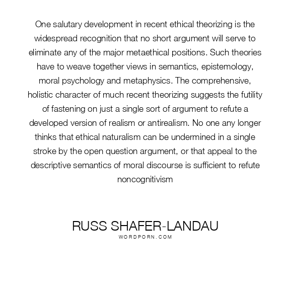 One salutary development in recent ethical theorizing is the widespread recognition that no short argument will serve to eliminate any of the major metaethical positions. Such theories have to weave together views in semantics, epistemology, moral psychology and metaphysics. The comprehensive, holistic character of much recent theorizing suggests the futility of fastening on just a single sort of argument to refute a developed version of realism or antirealism. No one any longer thinks that ethical naturalism can be undermined in a single stroke by the open question argument, or that appeal to the descriptive semantics of moral discourse is sufficient to refute noncognitivism