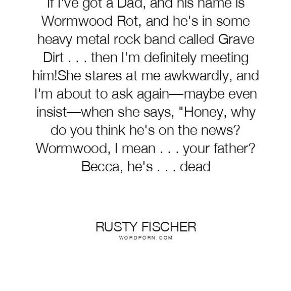 Rusty Fischer quote. If I've got a Dad, and his name is Wormwood Rot, and he's in some heavy metal rock band called Grave Dirt . . . then I'm definitely meeting him!She stares at me awkwardly, and I'm about to ask again—maybe even insist—when she says,