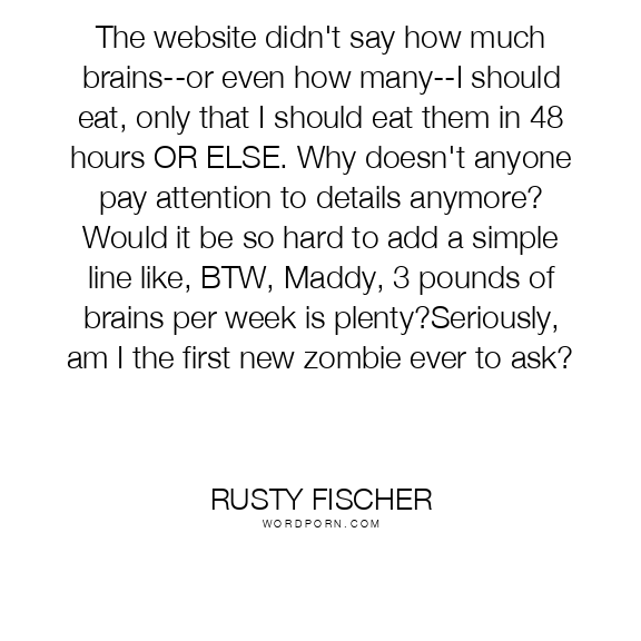 Rusty Fischer quote. The website didn't say how much brains--or even how many--I should eat, only that I should eat them in 48 hours OR ELSE. Why doesn't anyone pay attention to details anymore? Would it be so hard to add a simple line like, BTW, Maddy, 3 pounds of brains per week is plenty?Seriously, am I the first new zombie ever to ask?