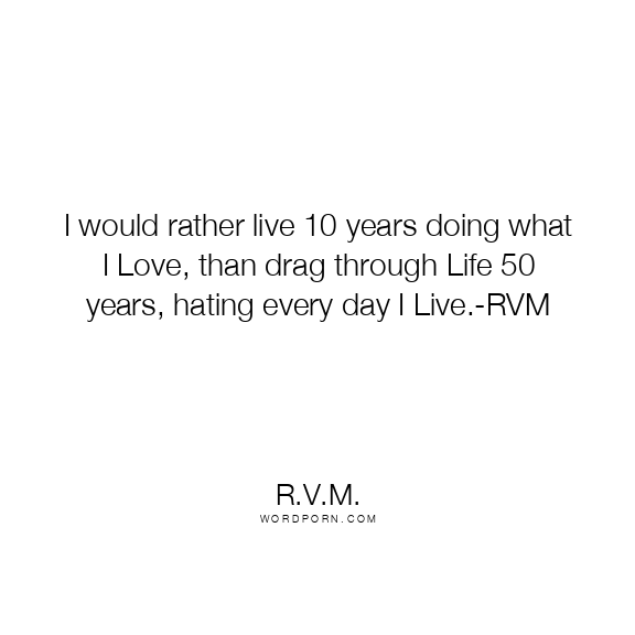 I would rather live 10 years doing what I Love, than drag through Life 50 years, hating every day I Live.-RVM