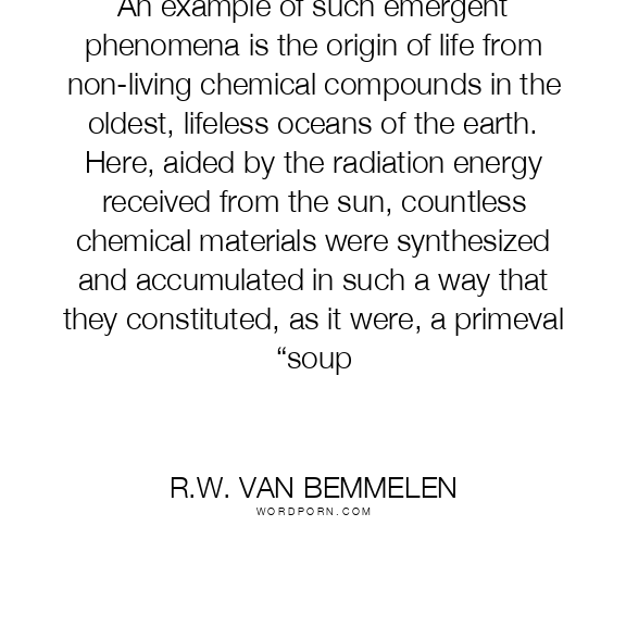 An example of such emergent phenomena is the origin of life from non-living chemical compounds in the oldest, lifeless oceans of the earth. Here, aided by the radiation energy received from the sun, countless chemical materials were synthesized and accumulated in such a way that they constituted, as it were, a primeval “soup