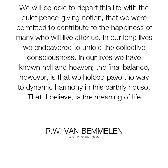 We will be able to depart this life with the quiet peace-giving notion, that we were permitted to contribute to the happiness of many who will live after us. In our long lives we endeavored to unfold the collective consciousness. In our lives we have known hell and heaven; the final balance, however, is that we helped pave the way to dynamic harmony in this earthly house. That, I believe, is the meaning of life