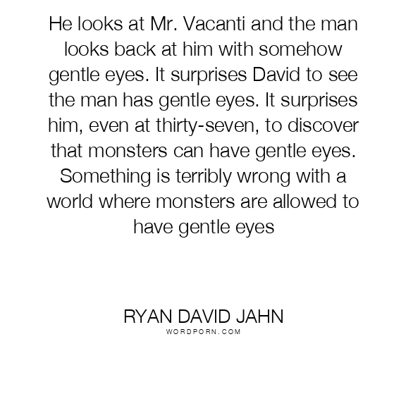 He looks at Mr. Vacanti and the man looks back at him with somehow gentle eyes. It surprises David to see the man has gentle eyes. It surprises him, even at thirty-seven, to discover that monsters can have gentle eyes. Something is terribly wrong with a world where monsters are allowed to have gentle eyes