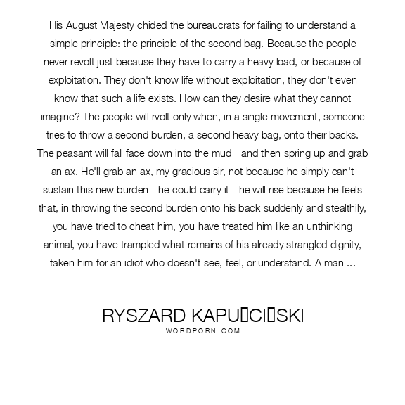 His August Majesty chided the bureaucrats for failing to understand a simple principle: the principle of the second bag. Because the people never revolt just because they have to carry a heavy load, or because of exploitation. They don't know life without exploitation, they don't even know that such a life exists. How can they desire what they cannot imagine? The people will rvolt only when, in a single movement, someone tries to throw a second burden, a second heavy bag, onto their backs. The peasant will fall face down into the mud - and then spring up and grab an ax. He'll grab an ax, my gracious sir, not because he simply can't sustain this new burden - he could carry it - he will rise because he feels that, in throwing the second burden onto his back suddenly and stealthily, you have tried to cheat him, you have treated him like an unthinking animal, you have trampled what remains of his already strangled dignity, taken him for an idiot who doesn't see, feel, or understand. A man doesn't seize an ax in defense of his wallet, but in defense of his dignity, and that, dear sir, is why His Majesty scolded the clerks. For their own convenience and vanity, instead of adding the burden bit by bit, in little bags, they tried to heave a whole big sack on at once
