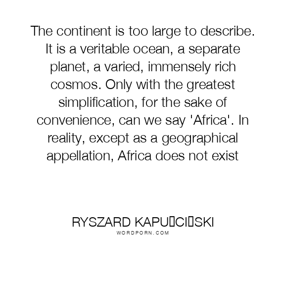 The continent is too large to describe. It is a veritable ocean, a separate planet, a varied, immensely rich cosmos. Only with the greatest simplification, for the sake of convenience, can we say 'Africa'. In reality, except as a geographical appellation, Africa does not exist