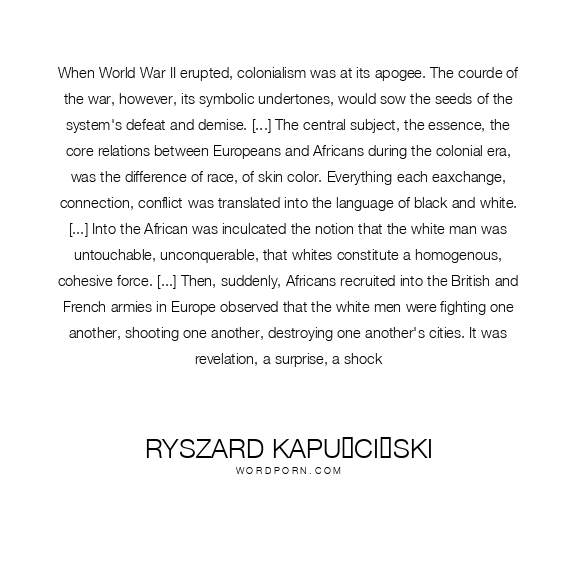 When World War II erupted, colonialism was at its apogee. The courde of the war, however, its symbolic undertones, would sow the seeds of the system's defeat and demise. [...] The central subject, the essence, the core relations between Europeans and Africans during the colonial era, was the difference of race, of skin color. Everything-each eaxchange, connection, conflict-was translated into the language of black and white. [...] Into the African was inculcated the notion that the white man was untouchable, unconquerable, that whites constitute a homogenous, cohesive force. [...] Then, suddenly, Africans recruited into the British and French armies in Europe observed that the white men were fighting one another, shooting one another, destroying one another's cities. It was revelation, a surprise, a shock